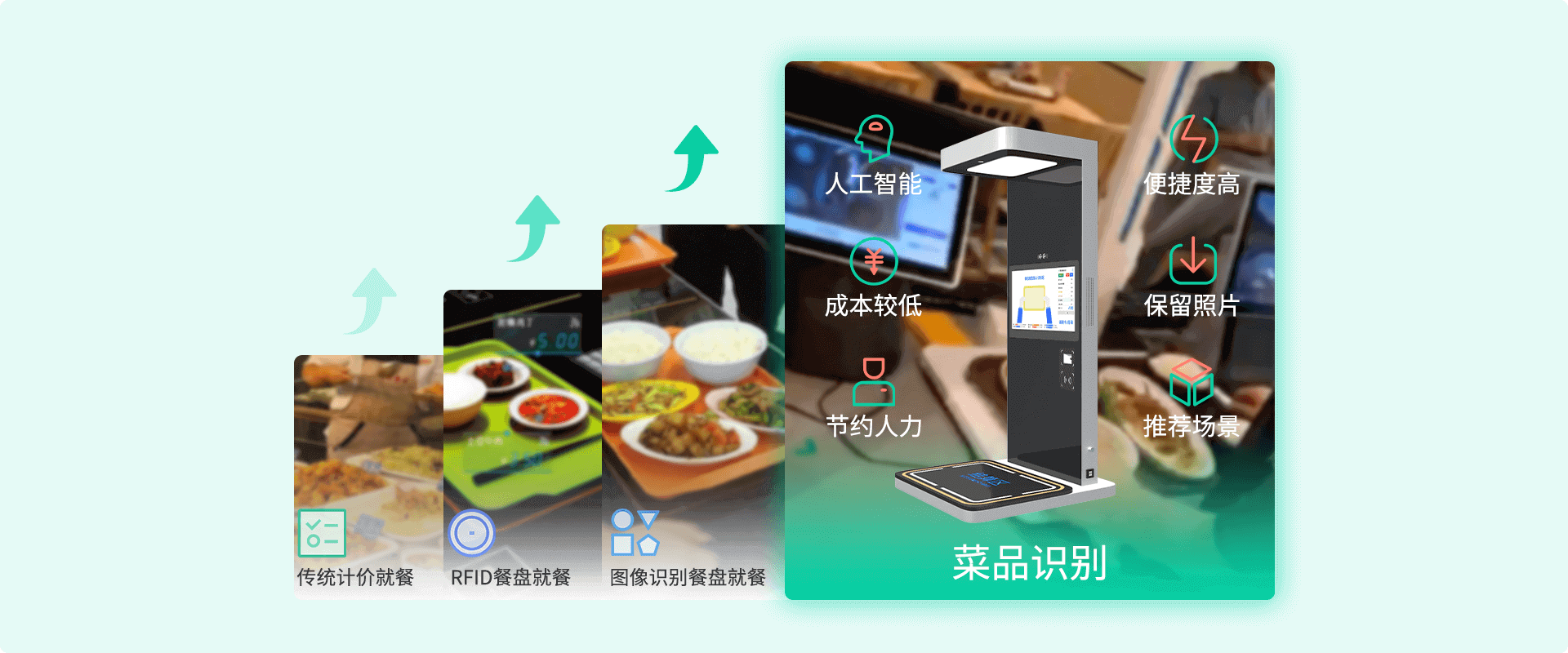 识别: 将托盘放置到识别区,系统自动识别菜品并结算总价